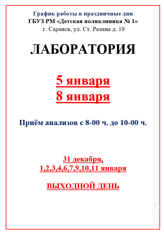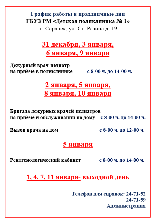 ГБУЗ РМ "Детская поликлиника №1" является медицинской организацией оказывающей первичную медико-санитарную помощь гражданам г. Саранска, прописанным в районе обслуживания, а также гражданам, прикрепленным на медицинское обеспечение. Здоровье – бесценный ресурс человеческой жизни. Оно дает возможность чувствовать себя счастливым хотя бы потому, что ничего не болит. Здоровье позволяет много трудиться, полноценно отдыхать, справляться с множеством проблем с легкостью. Формировать здоровый образ жизни необходимо смолоду, с дошкольной и школьной скамьи. Состояние здоровья населения, а в первую очередь детей и молодежи – важнейший показатель благополучия общества и государства. Поэтому укрепление здоровья населения, существенное снижение детской, младенческой смертности, снижение уровня социально значимых заболеваний, создание условий медицинской помощи по различным направлением является основой деятельности нашего учреждения.