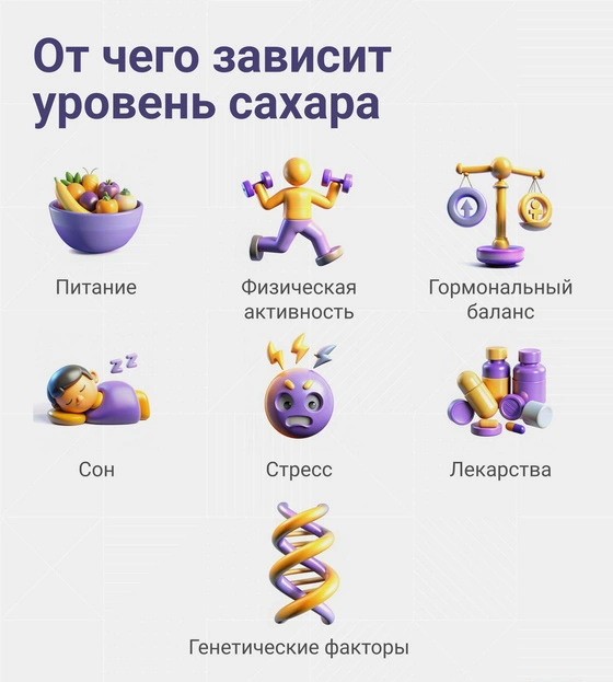Но уровень сахара в крови зависит не только от пищи. Также на него влияют занятия спортом, лекарства, которые вы принимаете, количество сна, а также стресс, генетические факторы и гормональный баланс.